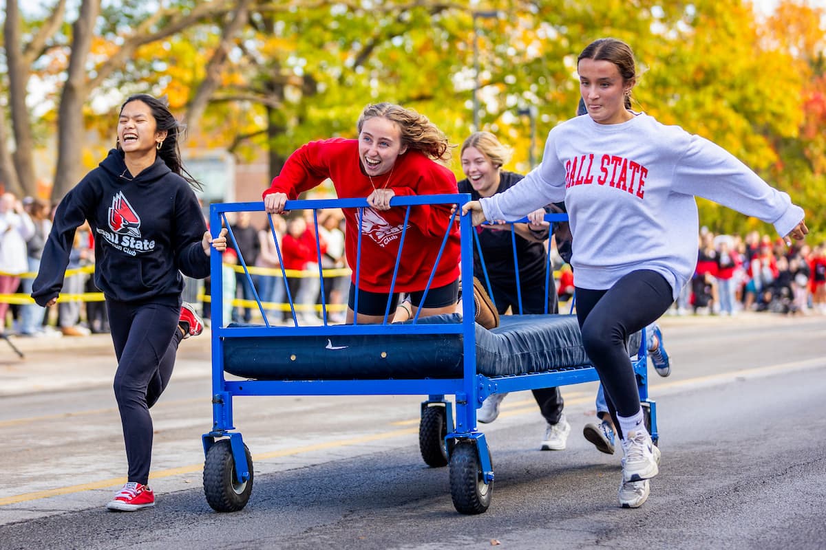 Bed Race is an annual Homecoming tradition where student groups compete racing beds down Riverside Avenue on campus.
